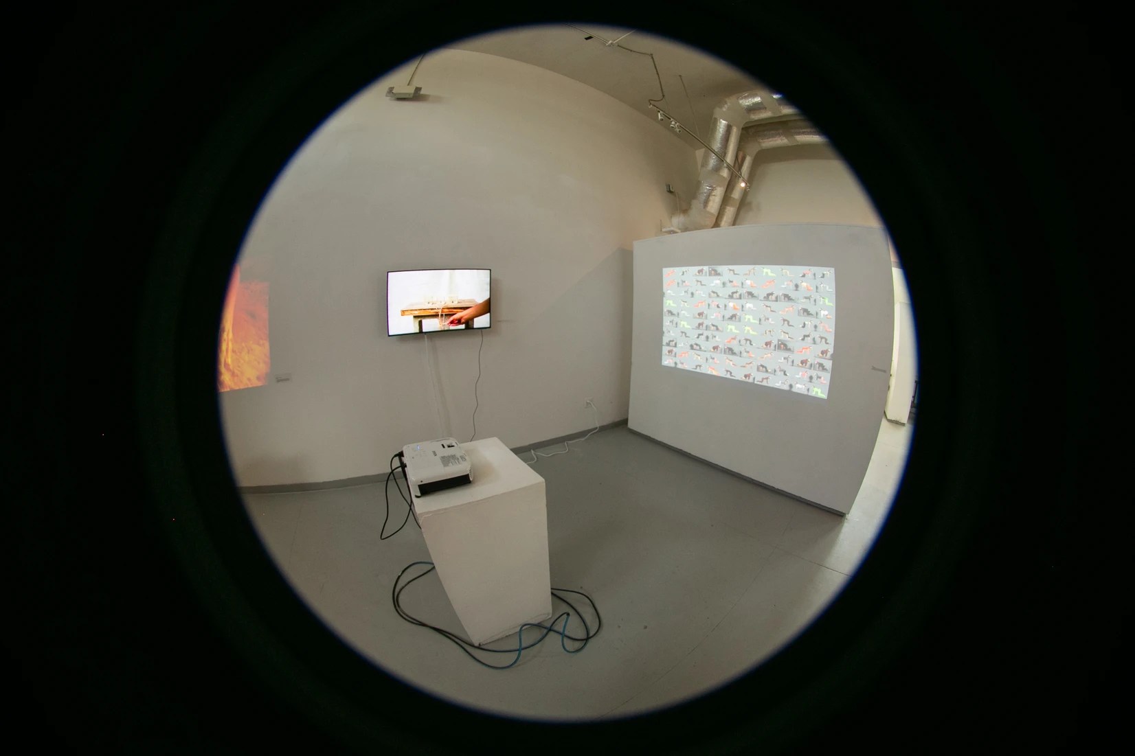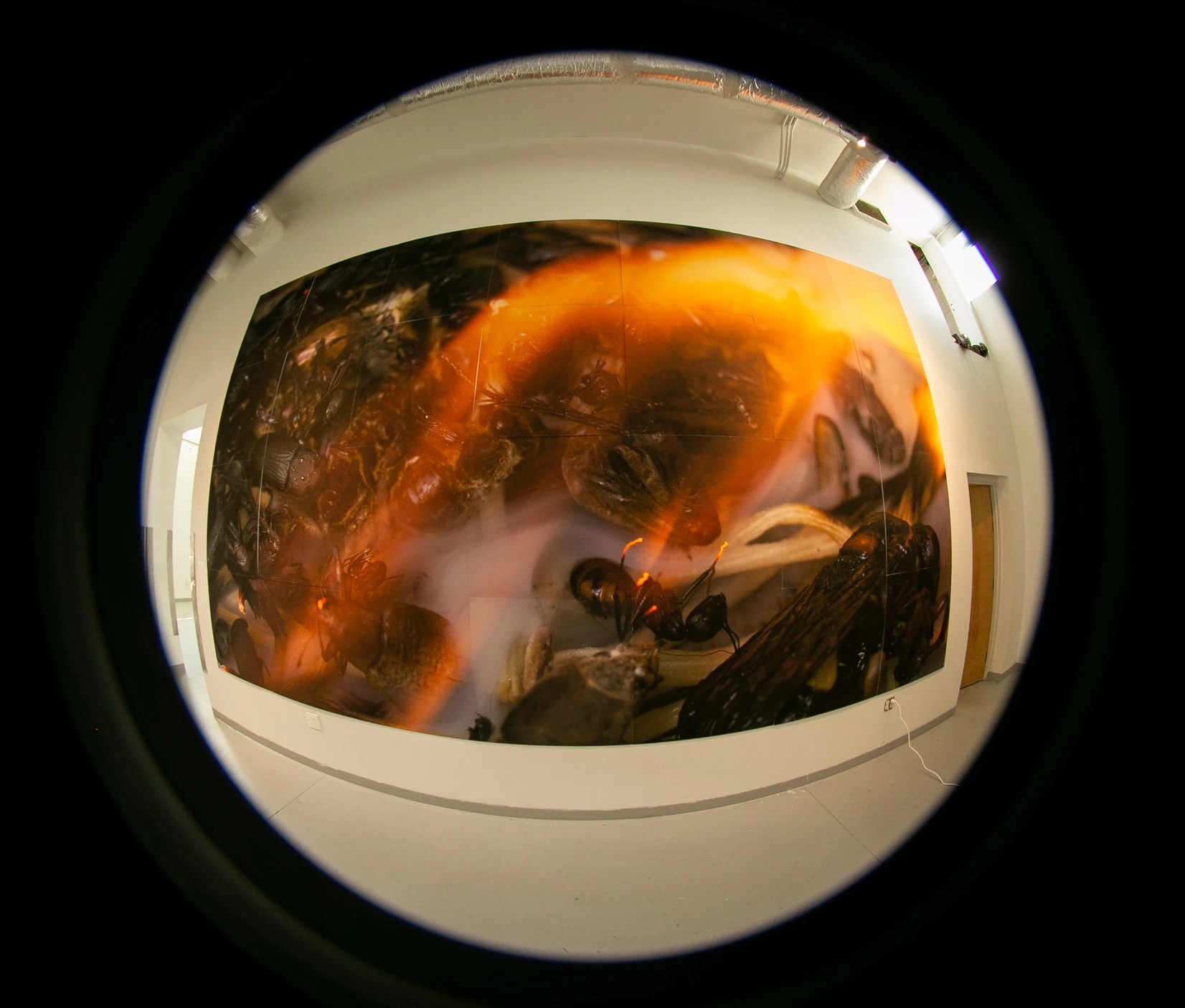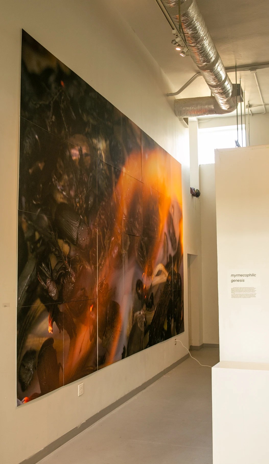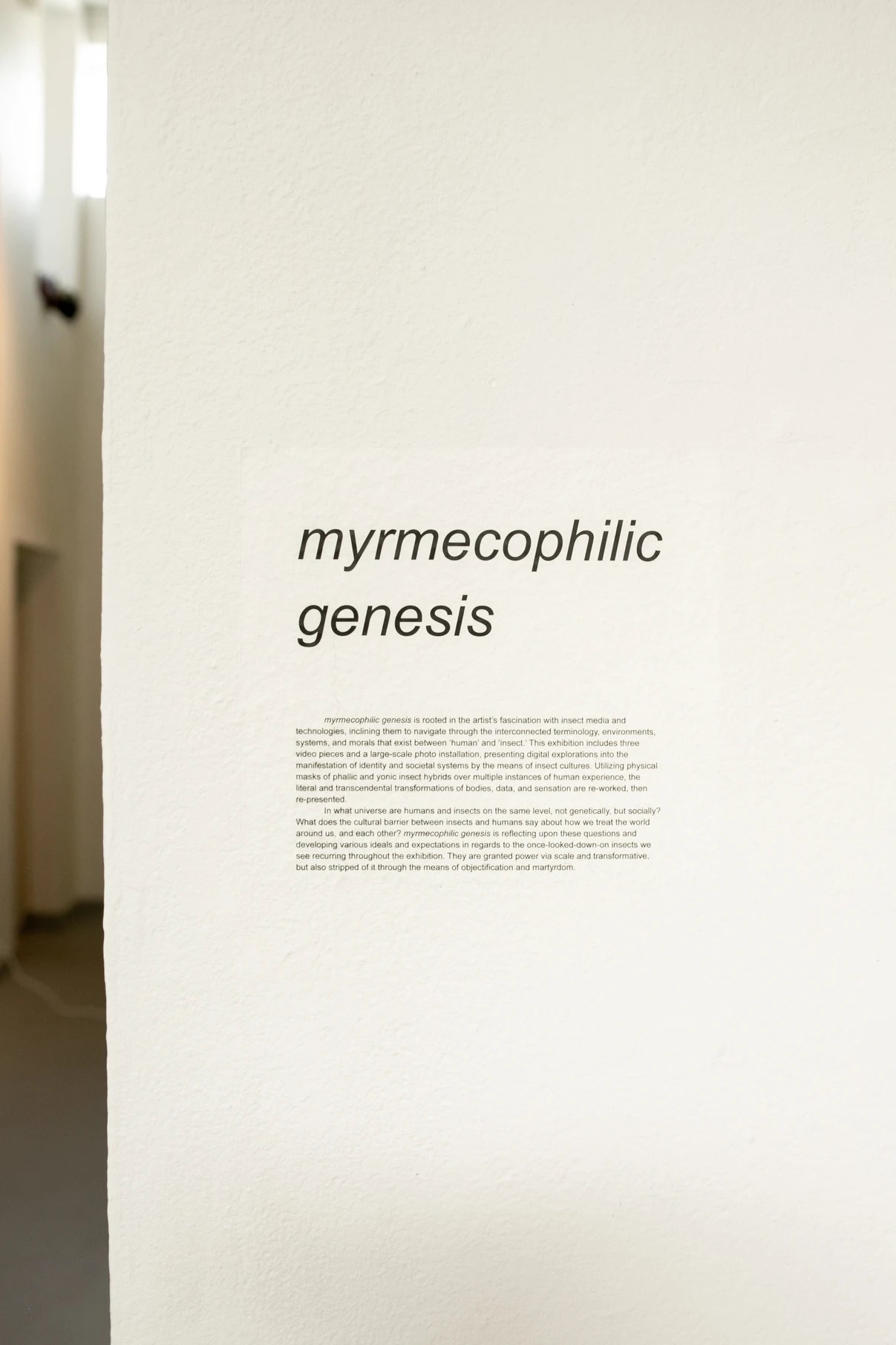 myrmecophilic genesis was a solo exhibition consisting of 4 individual works by Schwarz. A photographic installation, a short film projection, an LCD TV video performance documentation, and a looping AI generated video sequence via projection. The works were created in unison for the exhibition, making up a culmination of efforts of the senior thesis of the artist.