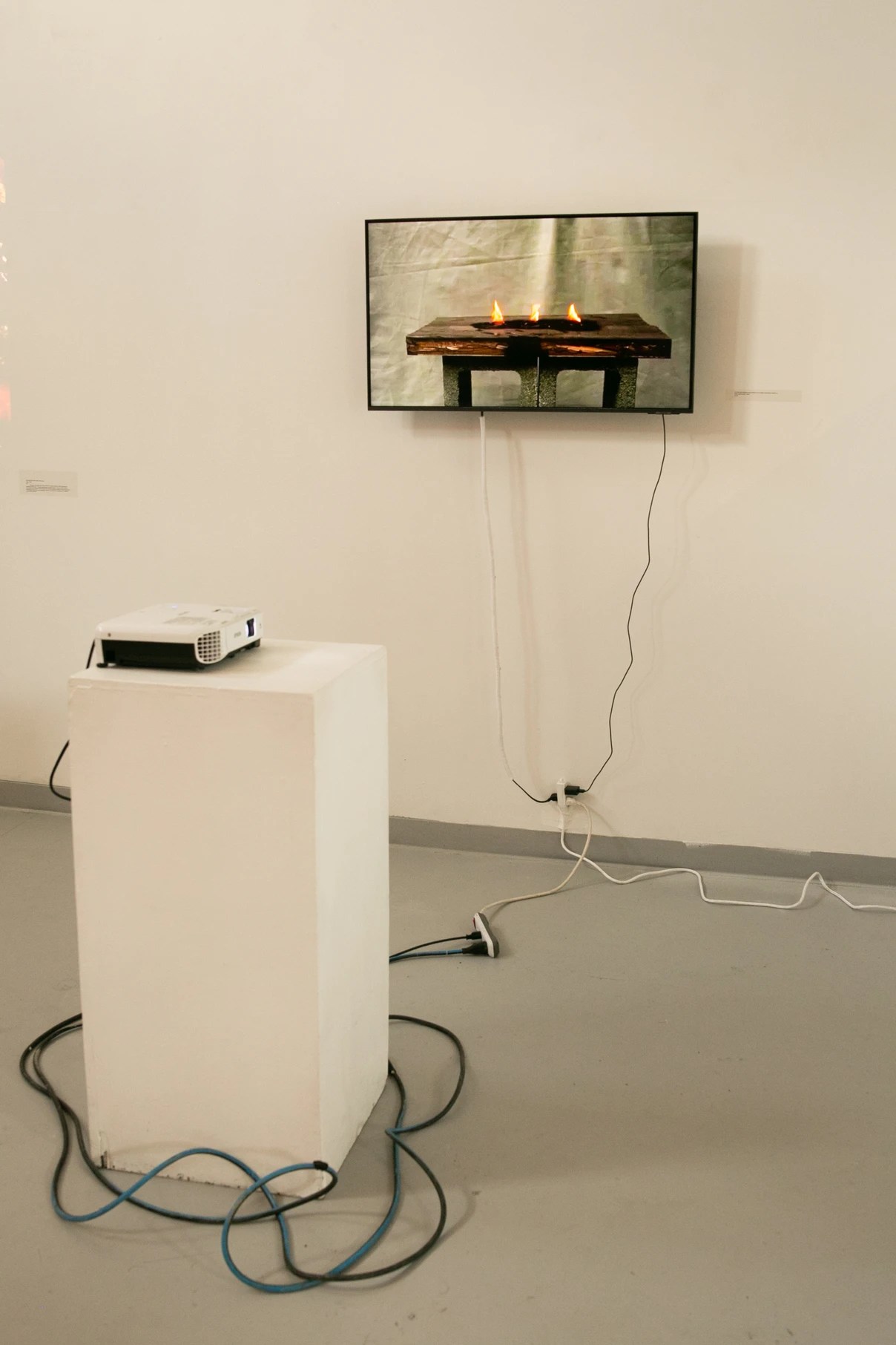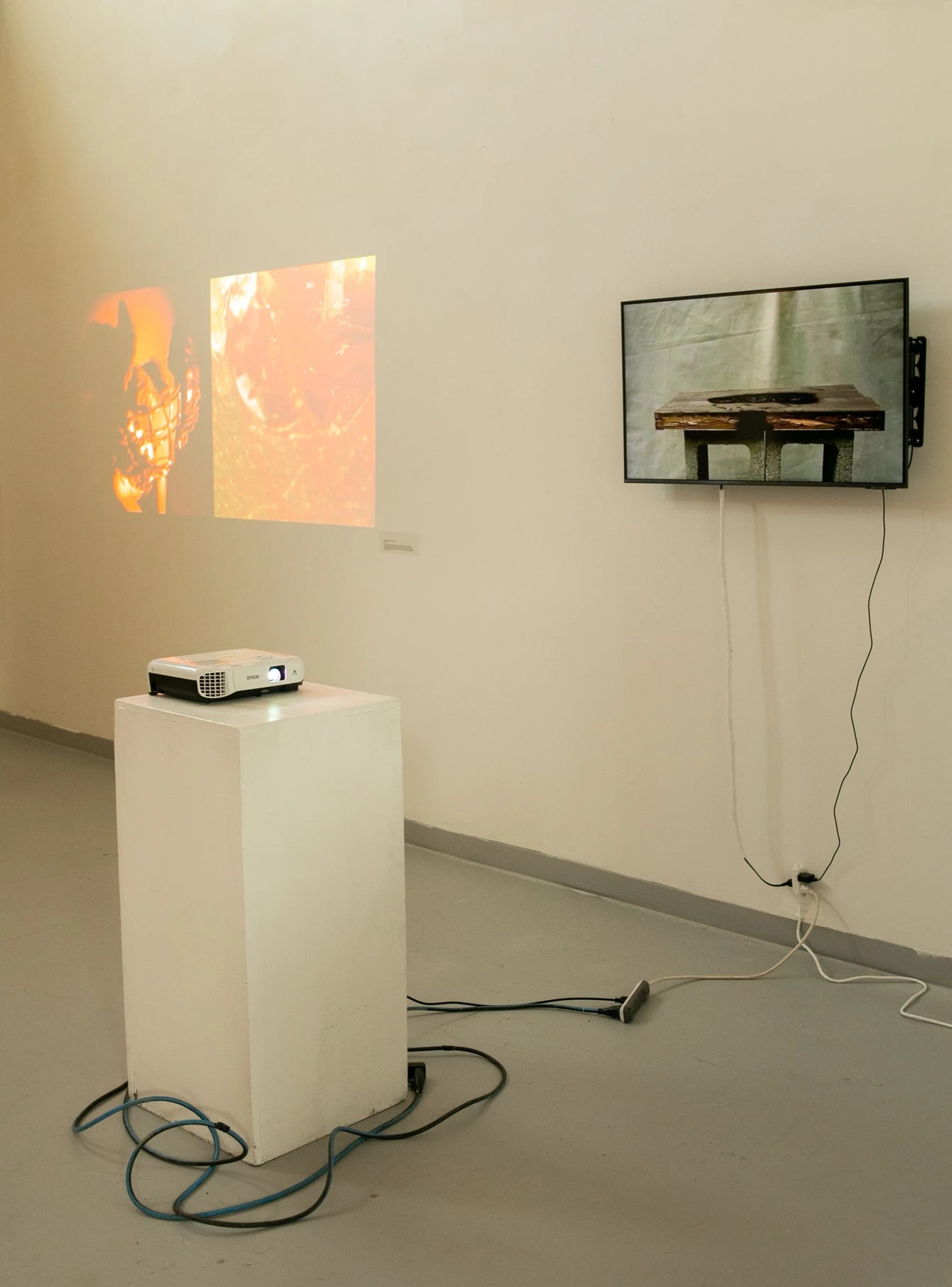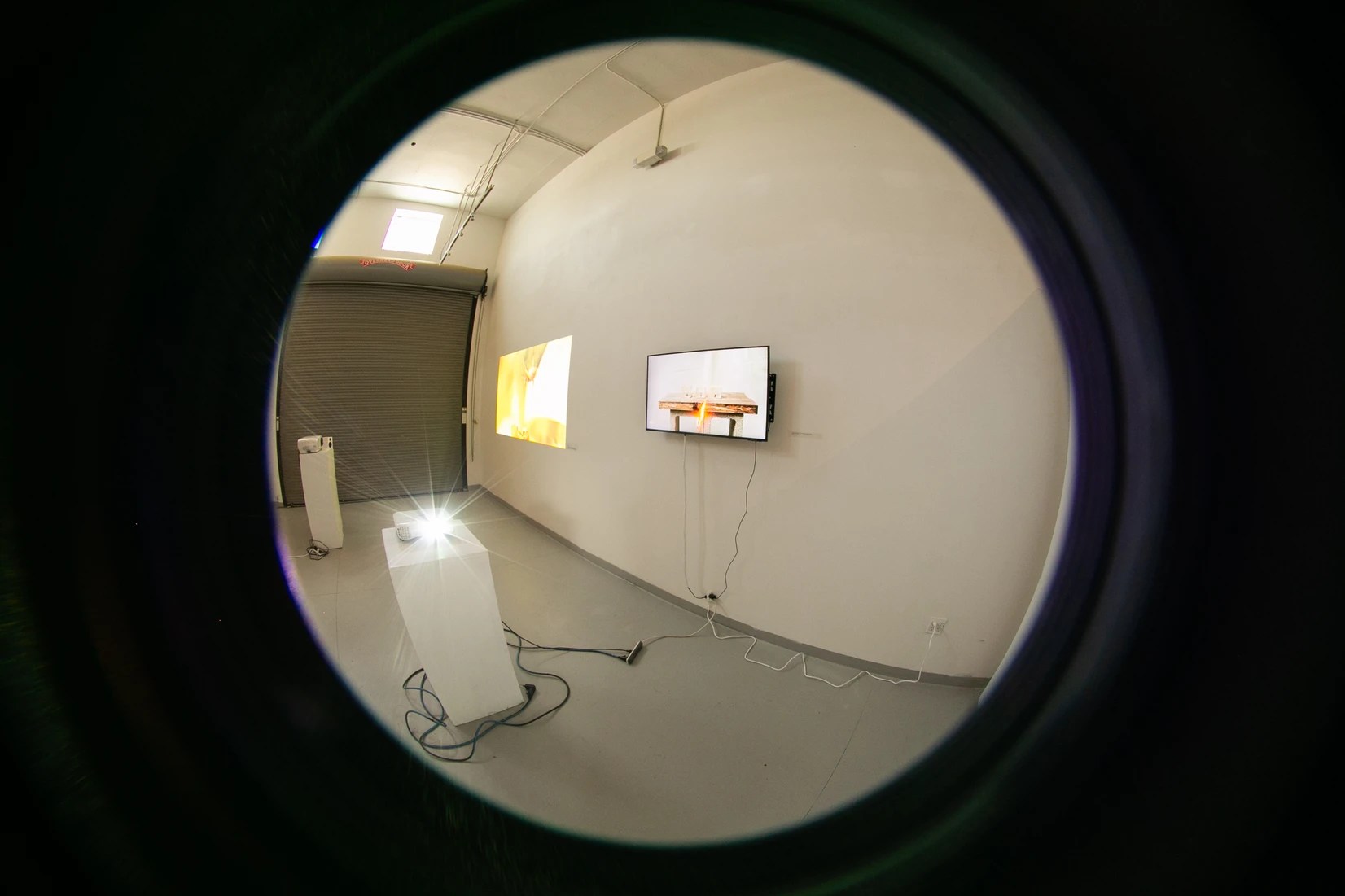 myrmecophilic genesis was a solo exhibition consisting of 4 individual works by Schwarz. A photographic installation, a short film projection, an LCD TV video performance documentation, and a looping AI generated video sequence via projection. The works were created in unison for the exhibition, making up a culmination of efforts of the senior thesis of the artist.